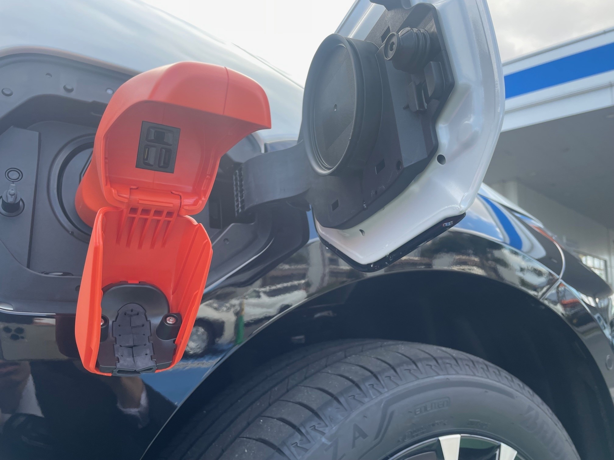 この写真では、運転席側と助手席側の充電口が両方開いた状態を写しています。