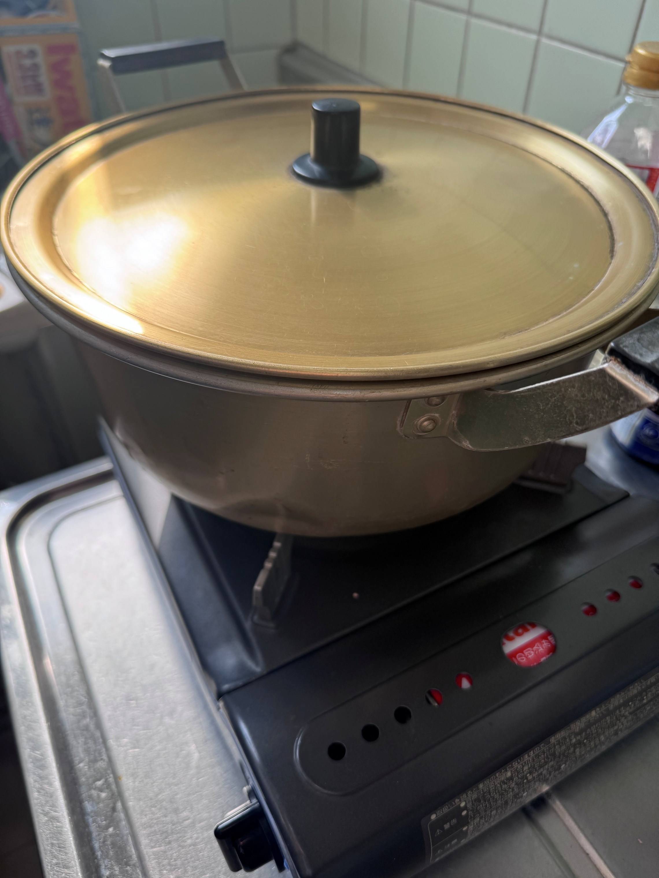 大きな鍋にて具材をぐつぐつことこと