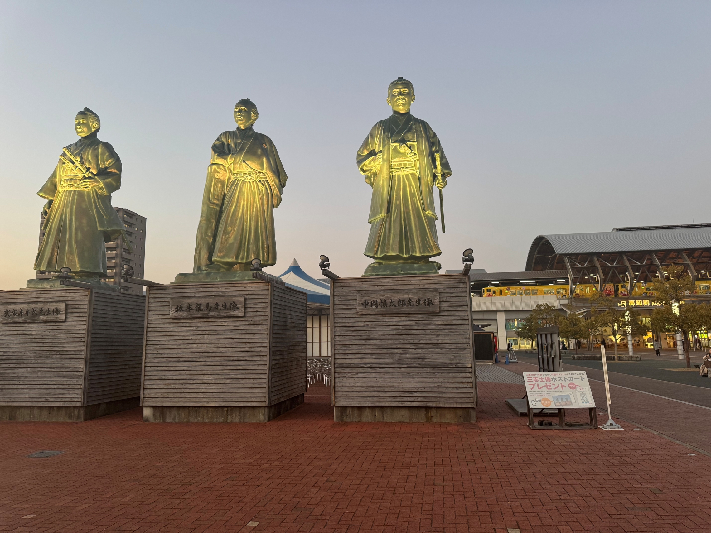 まずは高知駅の駅前で出会ったのが土佐三志士と言われる「坂本龍馬」「竹市半平太」「中岡慎太郎」の銅像です