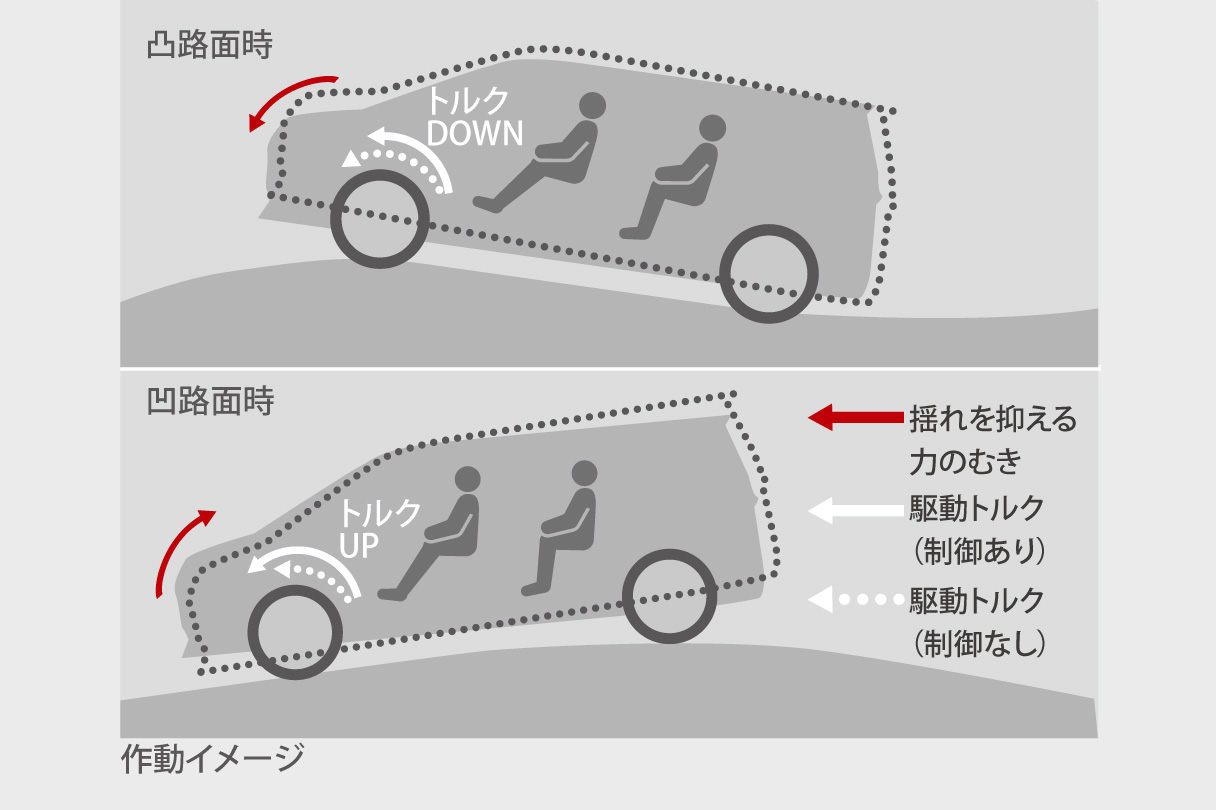 路面の凹凸に応じて、モーター(プラグインハイブリッド車、ハイブリッド車)・エンジン(ターボガソリン車)のトルクをリアルタイムに制御。車体の上下の縦揺れを抑制する効果を最大限にまで高め、サスペンションでは難しい、ばね上の初期の動き出しを止め、フラット感のさらなる向上に貢献しています。