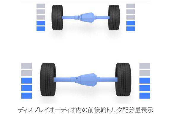 各輪にかかる駆動力(トルク)が大きい場合には目盛りの数が増加し、小さい場合には減少します。後輪の目盛りの数が少ない時はシステムが安定走行と判断し、燃費に寄与するために4WD機能を抑制している状態です。